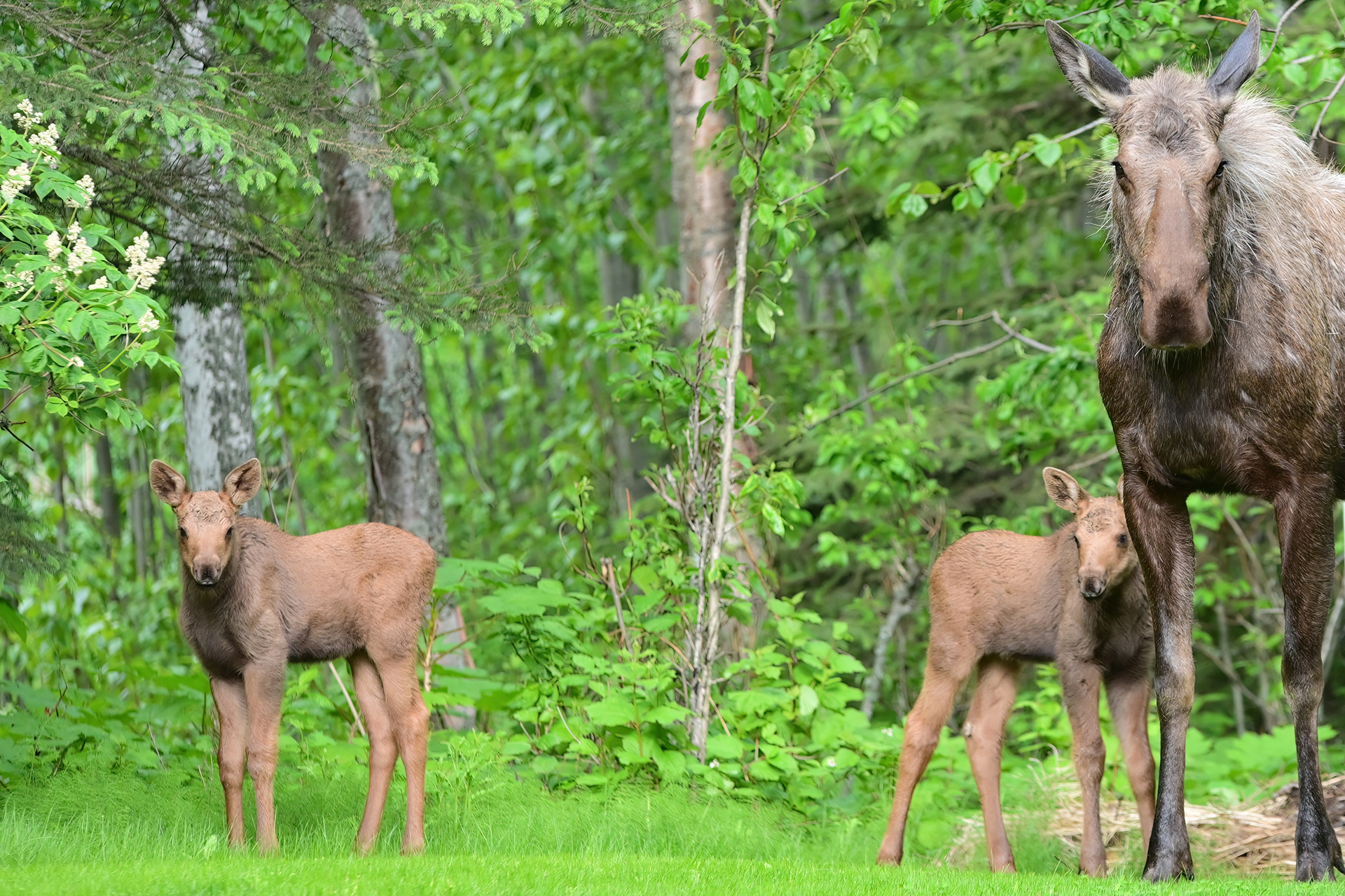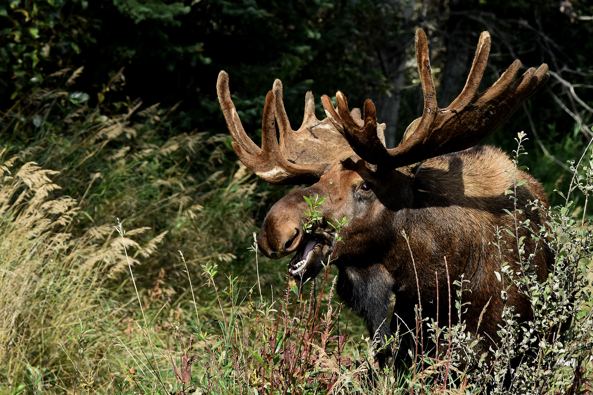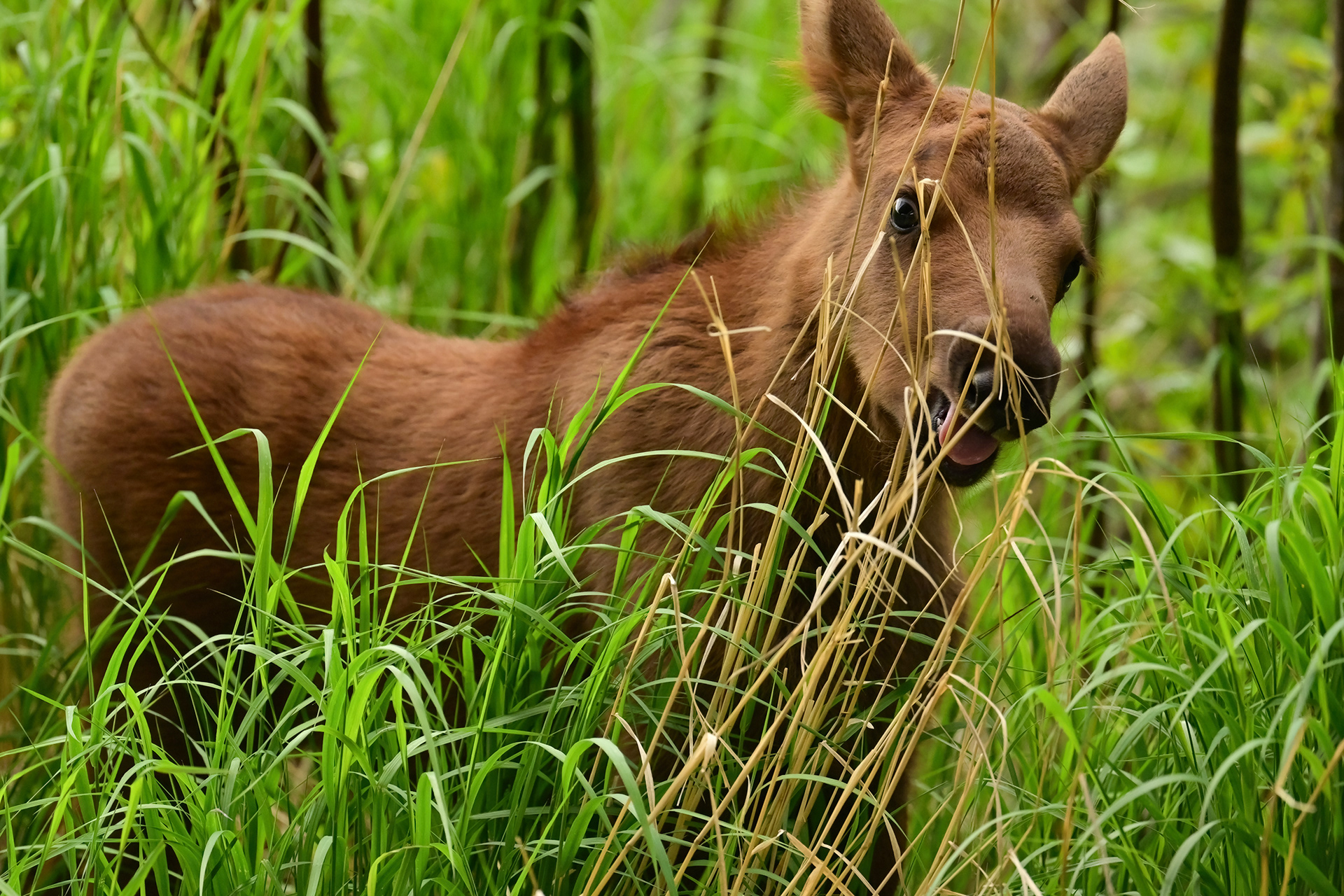 A week-old moose calf browses on grasses at Potter Marsh in Anchorage.