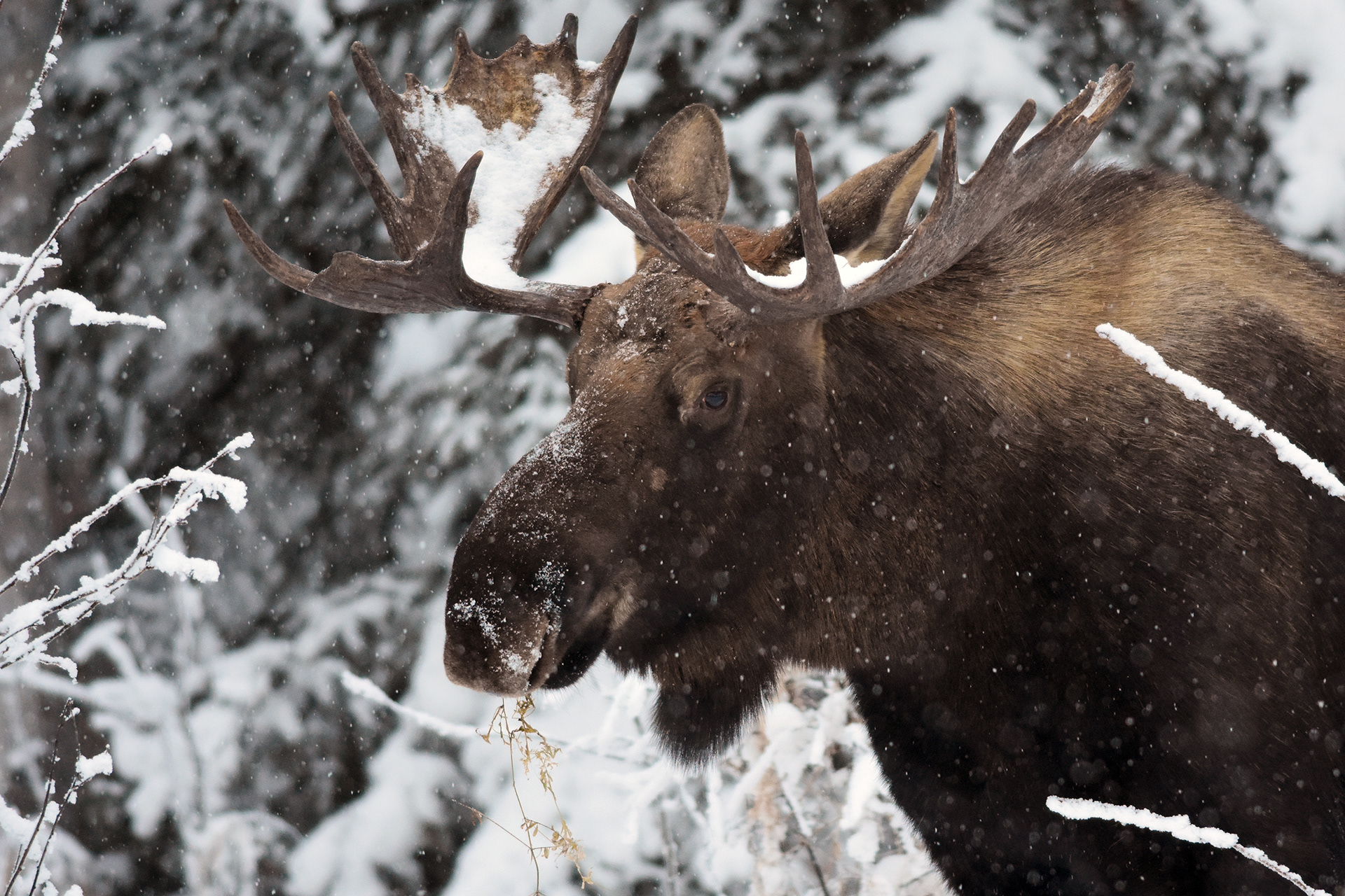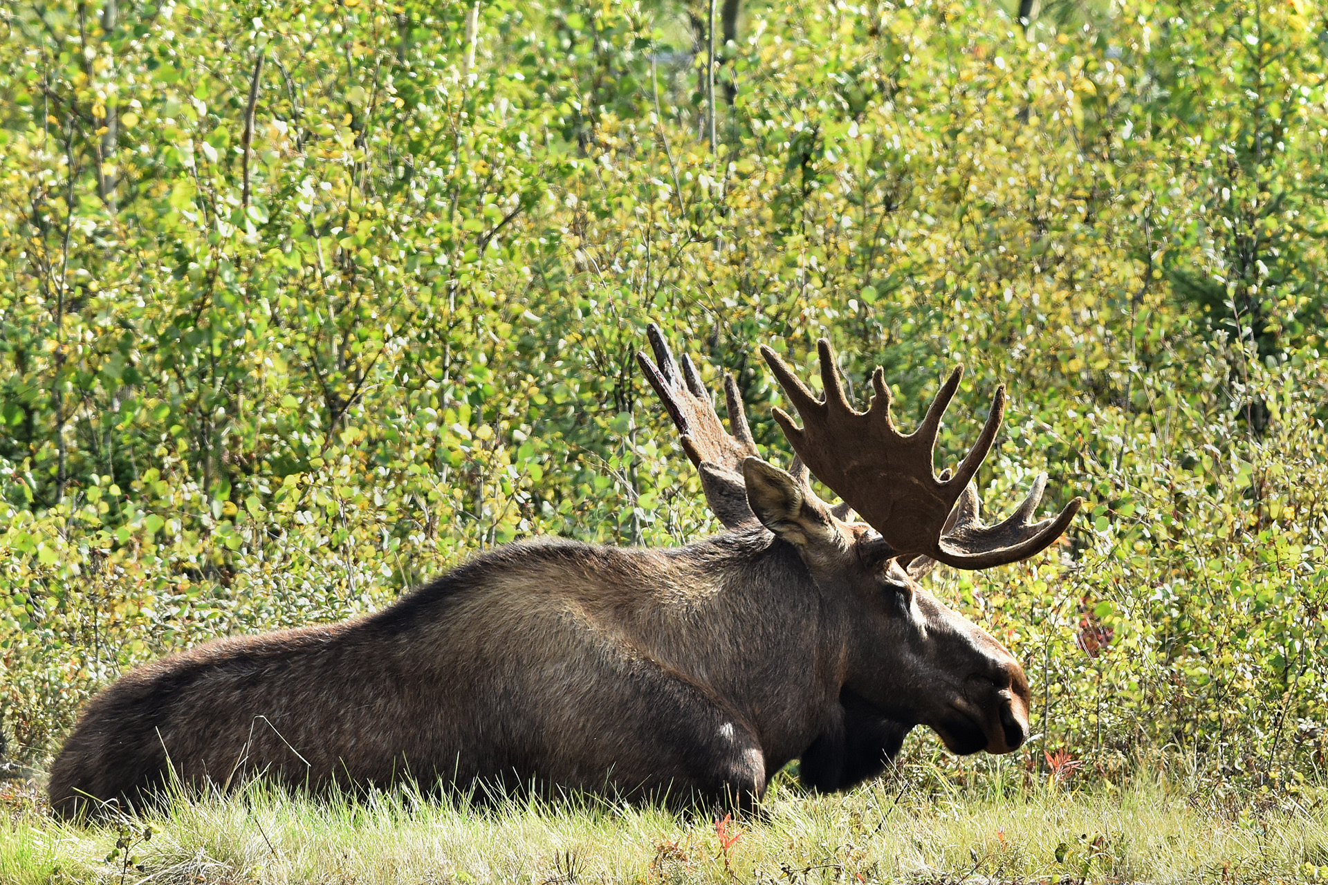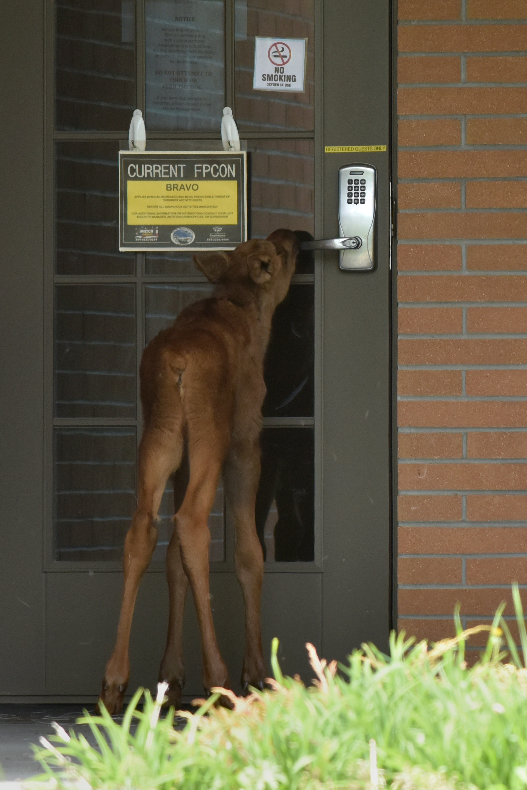 A week-old moose calf browses on grasses at Potter Marsh in Anchorage.