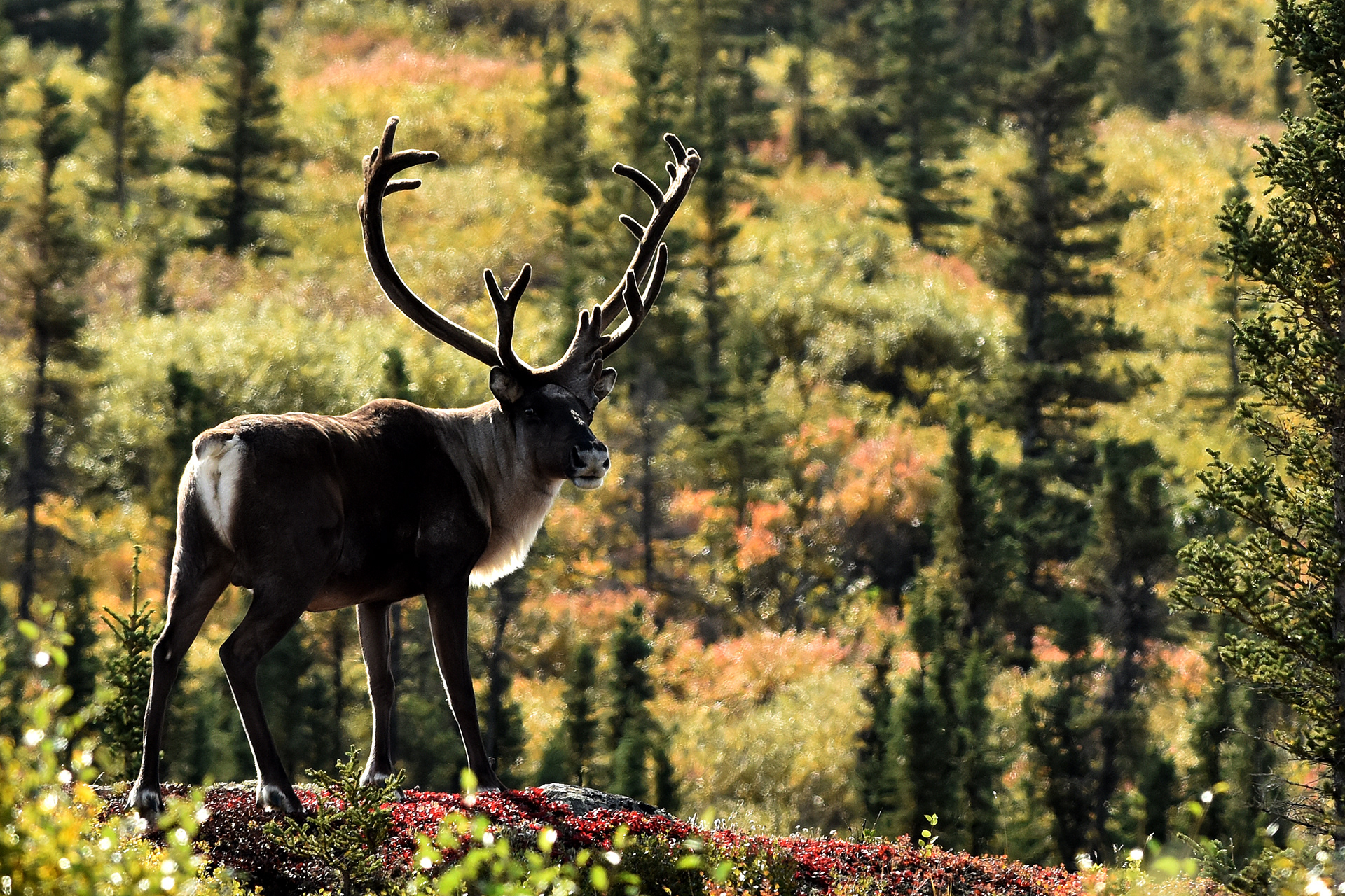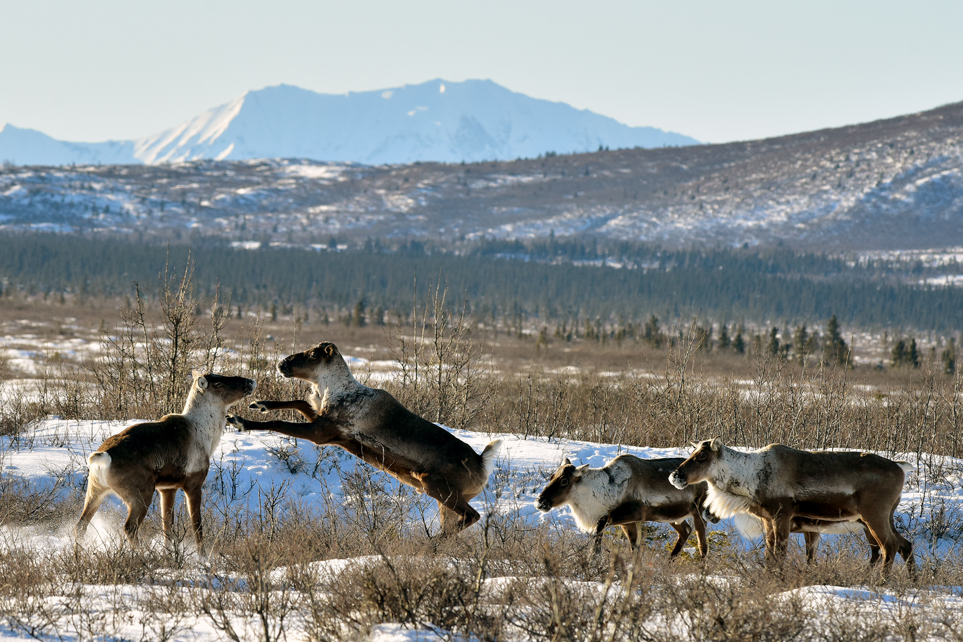 A herd of wild caribou in Denali National Park and Preserve.